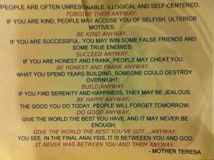 If you are kind, people may accuse you of selfish, ulterior motives; Be kind anyway.