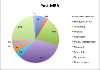 - MBA이후에도 Consulting 과 Finance로 가는 비율이 50% 정도로 비슷하다. 참고로 Pre MBA Financial service 는 PE를 제외한 주로 IB/Hedge Fund라면 MBA이후Finance는 PE, VC, HedgeFund를 포함한 광범위한 개념이다. (그래서 32%p나 된다.) Finance 32%p중 PE가 12%p, VC가 8%p, Investment Banking은 4%p이다. CleanTech, Energy는 아직 10%를 믿도는 소수이다.
