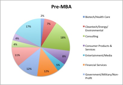 - 컨설팅이 MBA 전과 후를 통틀어 전반적으로 가장 인기있다는 것을 알 수 있다. MBA전과 후 모두 가장 많은 학생을 채용하는 회사는 매킨지이다. 단 상당수는 직장을 바꾼다. 즉 컨설팅을 했던 친구 중 상당수가 다른 Industry로 가고 (물론 스폰도 있지만) Non profit이나 기타 비 전통적인 일을 했던 친구들이 경영수업을 받고자 컨설팅으로 가는 경우가 꽤 있다.