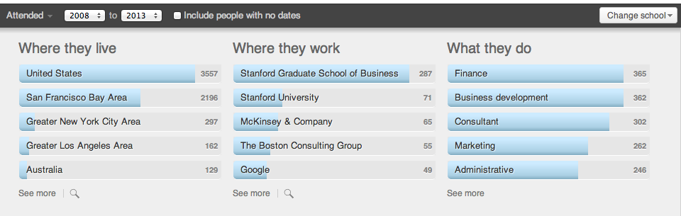 마지막으로 링크딘에 새로 추가된 기능, 학교별로 출신 학생들이 어디서 살고 일하고 뭘 하는지 볼 수 있는 기능을 이용한 분석이다. 2008~2013년으로 검색했는데 현직 학생이 워낙 많아서 Where에서는 스탠포드가 절대적이다. 나머지도 한번 재미로 보시기 바란다. 이건 아주 정확하진 않다.
