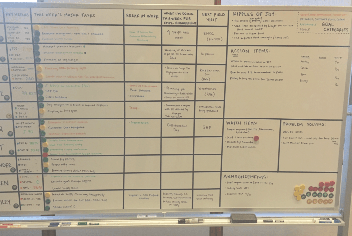 얼마전에 만난 이동네의 큰 회사에서 SVP로 있는 분이 결국 오퍼레이션은 실행력이 핵심이라며, 자기는 매일 짧게라도 자신이 하는 일을 이야기하고 서로 도움을 요청하는 팀 허들 미팅 (team huddle meeting)을 자신있게 추천한다며 예전에 자신이 했던 보드를 보여줬다. 참 보기만해도 일이 착 정리되서 잘 될것 같은 느낌이었다. 그래서 우리팀에도 도입해서 해보고 있는데 며칠 안됐지만 반응이 나쁘지 만은 않다. 내가 하고 있는 일, 내가 오늘 집중해서 할일도 미리 팀원들에게 공유하니 서로 신뢰도 쌓이고 일을 부탁하거나 할때 어떤 목적인지도 더 알수 있고 좋은게 참 많다.