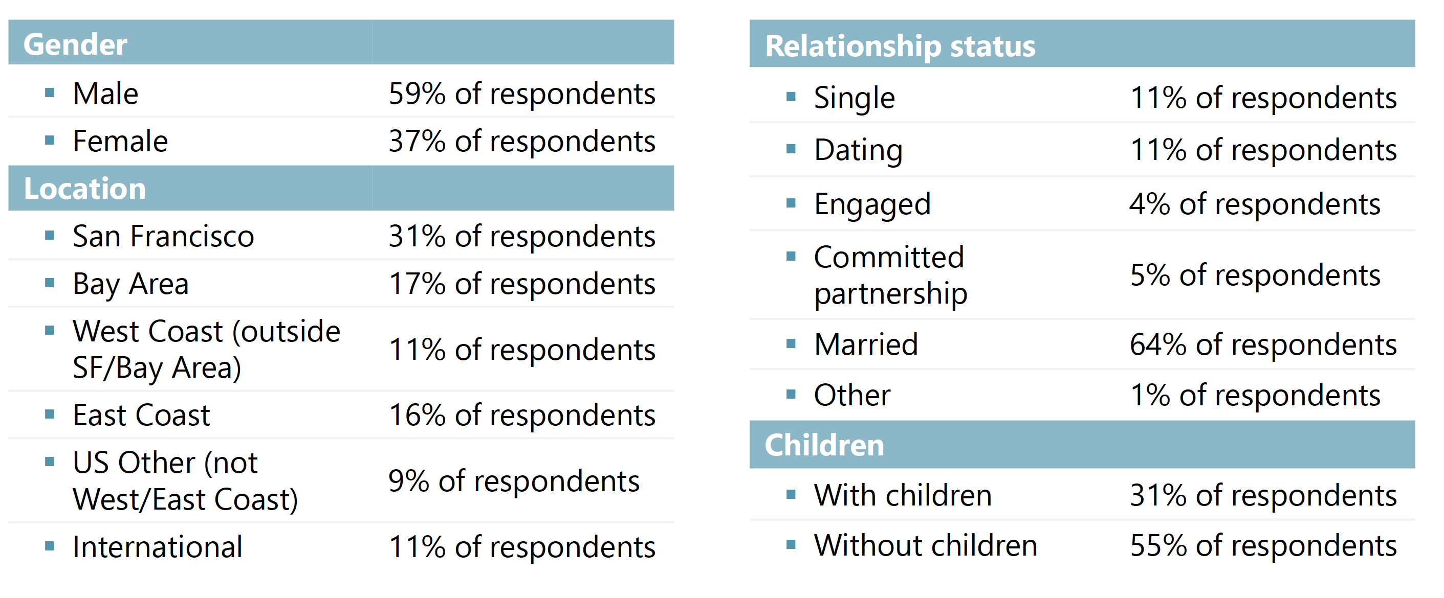 • MBA 졸업하고 베이 에어리어에 남아 있는 친구가 적어도 반은 된다고 느껴진다. (통계에도 꽤 높이 나온듯). 하나 재밌었던건 베이에어리어 보다 그 밖에 살고 있는 사람들이 커리어나 삶에대한 만족도 더 높게 설문조사 결과 나온 것이다. 베이에어리어는 이 잘난 미국친구들한테도 항상 치열하게 경쟁하고 가장 잘나가는 peer와 스스로를 비교하게 되는 엄청 스트레스풀한 곳인것 같다.