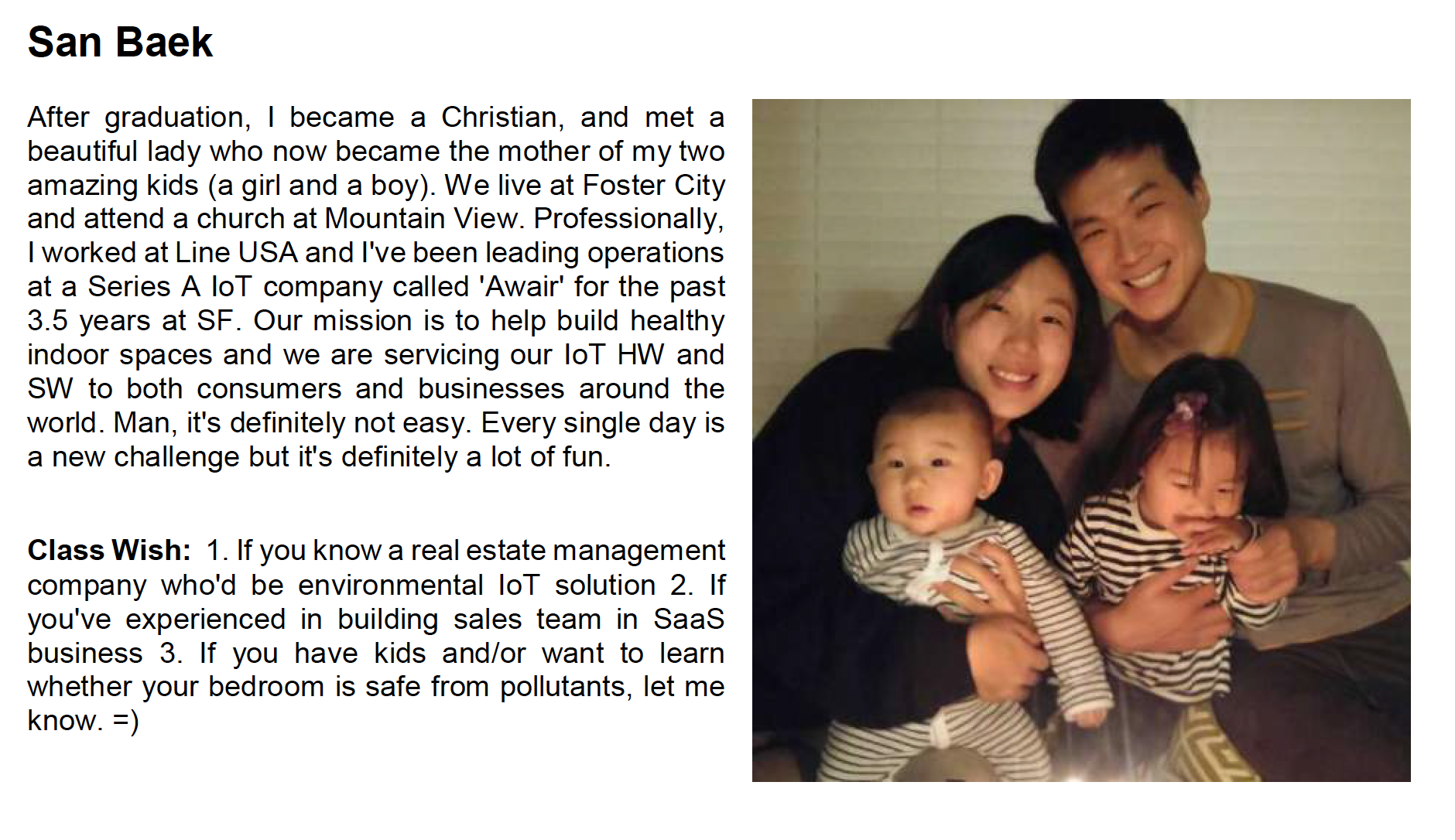 • Matt Bulloch 텐트 비지니스: 마케팅 이벤트 등에 쓰는 텐트를 만드는 비지니스를 미시건에서 한다. 원래 MBA오기 전에는 30명 정도의 회사였는데 이제는 100명 이상이 됐다고 한다. 몰몬 가정에서 자라서 지금은 크리스천이 된 친구로 군인 출신에 너무나 따뜻하고 정 많은 친구 (애도 셋이나 낳고) 다. 비지니스 엄청 응원하고 미시건 꼭 한번 놀러가야겠다.