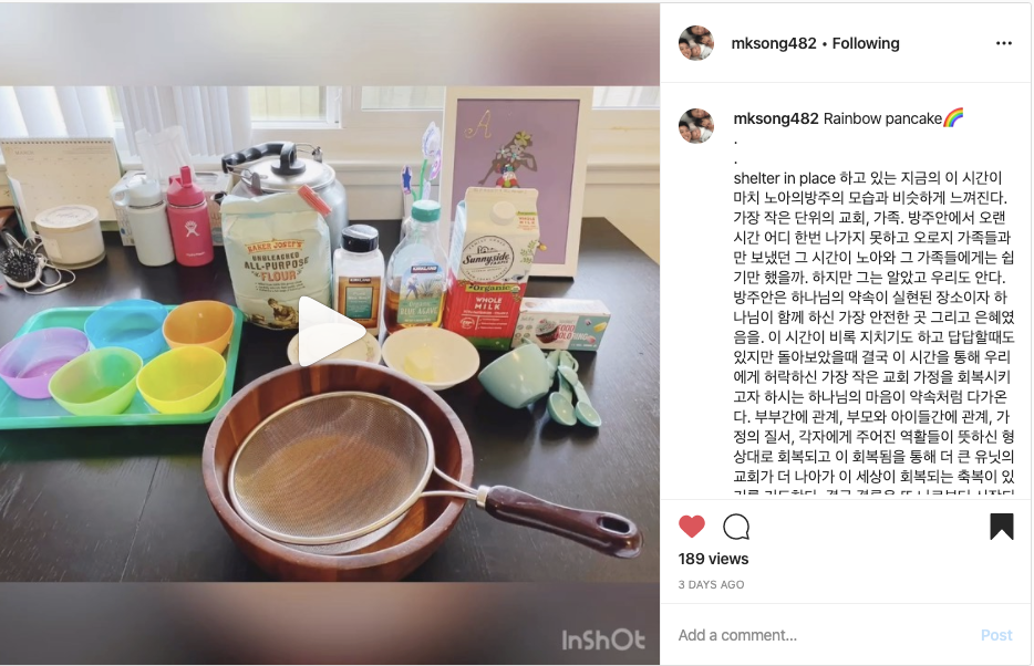 아내의 포스팅: shelter in place 하고 있는 지금의 이 시간이 마치 노아의방주의 모습과 비슷하게 느껴진다. 가장 작은 단위의 교회, 가족. 방주안에서 오랜시간 어디 한번 나가지 못하고 오로지 가족들과만 보냈던 그 시간이 노아와 그 가족들에게는 쉽기만 했을까. 하지만 그는 알았고 우리도 안다. 방주안은 하나님의 약속이 실현된 장소이자 하나님이 함께 하신 가장 안전한 곳 그리고 은혜였음을. 이 시간이 비록 지치기도 하고 답답할때도 있지만 돌아보았을때 결국 이 시간을 통해 우리에게 허락하신 가장 작은 교회 가정을 회복시키고자 하시는 하나님의 마음이 약속처럼 다가온다. 부부간에 관계, 부모와 아이들간에 관계, 가정의 질서, 각자에게 주어진 역활들이 뜻하신 형상대로 회복되고 이 회복됨을 통해 더 큰 유닛의 교회가 더 나아가 이 세상이 회복되는 축복이 있기를 기도한다. 결국 결론은 또 나로부터 시작되리. 나 부터 잘하자😂 회복하시는 하나님의 약속을 기억하며 오늘의 엑티비티는 무지개펜케잌