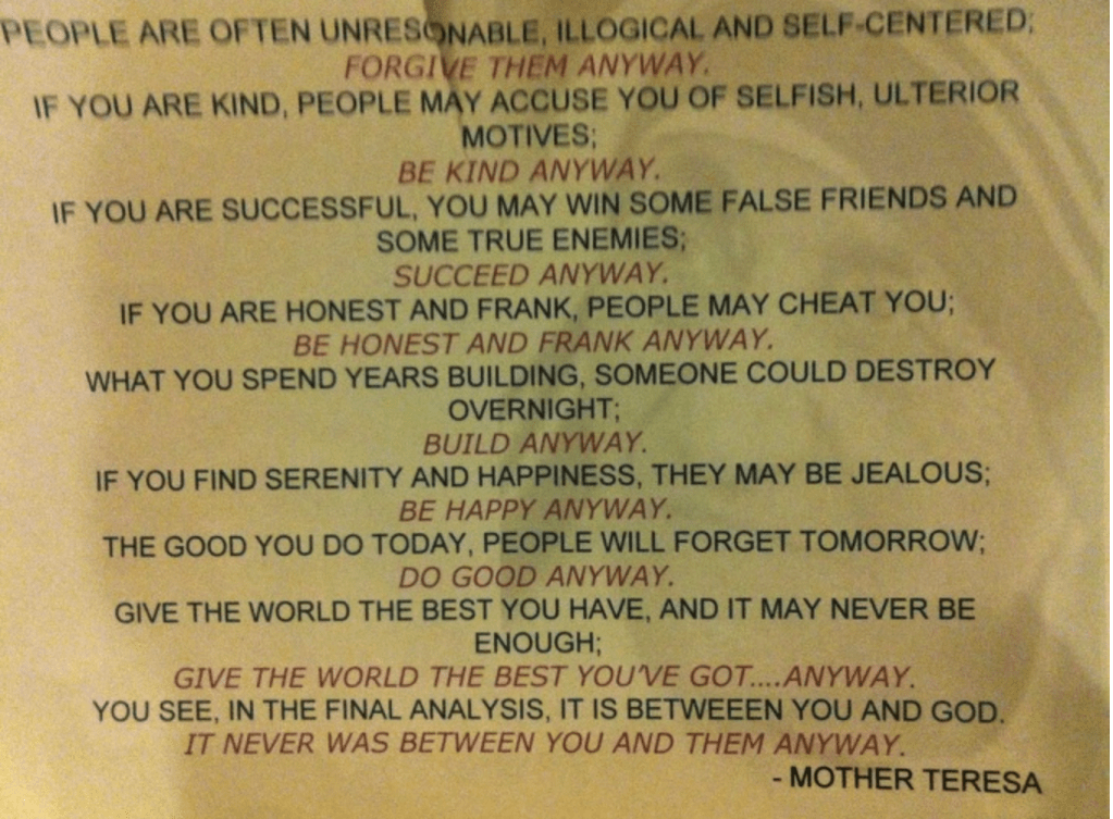 If you are kind, people may accuse you of selfish, ulterior motives; Be kind anyway.