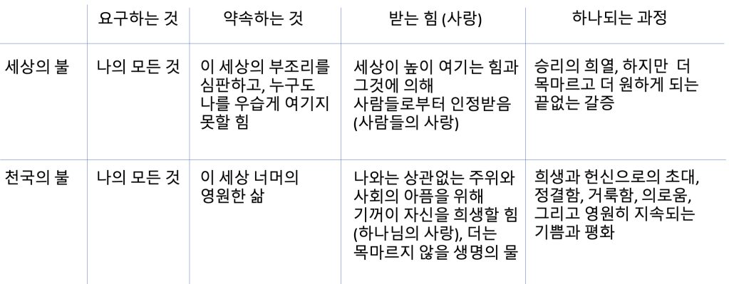 천국의 불은 전혀 다른 것을 약속한다. 이 아픔많고 부조리 많은 세상 너머에 새로운 삶, 영원한 삶이 있다고. 그리고 그 영원한 삶에 의롭게 된 존재로, 정결하고 거룩한 존재로 자신과 함께할 것이라고. 이미 그 모든것을 예비해 놓았다고.