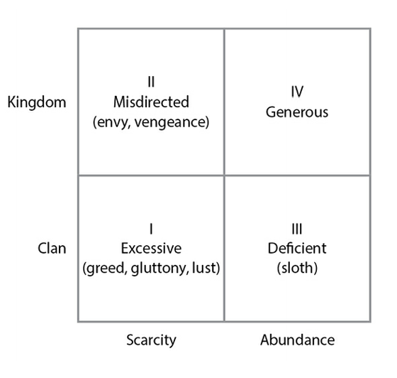 위는 일전에 소개한 적 있는 필자가 애정해 마지않는 2×2 매트릭스다. X축은 부족과 풍요를 나타내고 Y축은 내것과 사회를 나타낸다. 복음 – 기쁜 소식 (구세주가 모든것을 이루셨고 우리는 받아들임으로써 이 땅에서 천국을 누리고 살 수 있다 – 으로 세계를 보지 않고서는 우리는 세상을 자원의 유한성과 경쟁사회로 대표되는 “부족함 (X축 왼쪽)”으로 보게된다. 거기서 내것에 초점을 맞춘 삶은 1 – 좌측 아래쪽이 되고, 이웃에 관심을 향한 삶은 2 – 좌측 위쪽이 된다. 하지만 복음으로 세상을 보기 시작하면 우리는 4 – 우측 위쪽의 삶을 살 수 있다. 복음은 이렇게 이야기한다.