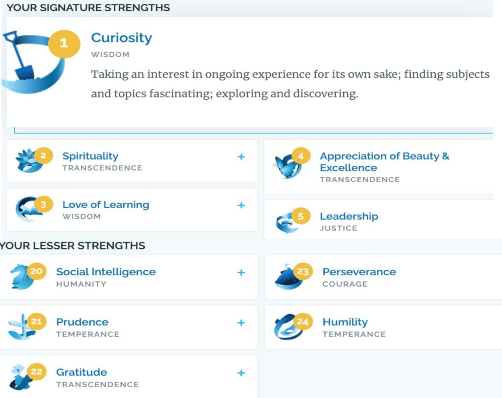 최근 지인의 권유로 캐릭터 (성향)의 강점을 파악하는 서베이 (링크)를 해봤다. 결과는 아래와 같다. 나의 강점으로 1) 호기심 2) 영성 3) 배움 4) 아름다움과 탁월함에 대한 추구 5) 리더십을 꼽았고 성향적으로 부족한 부분으로 1) EQ 2) 신중함 3) 감사 4) 인내 5) 겸손이 나왔다. 너무 맞아서 놀랐다.
