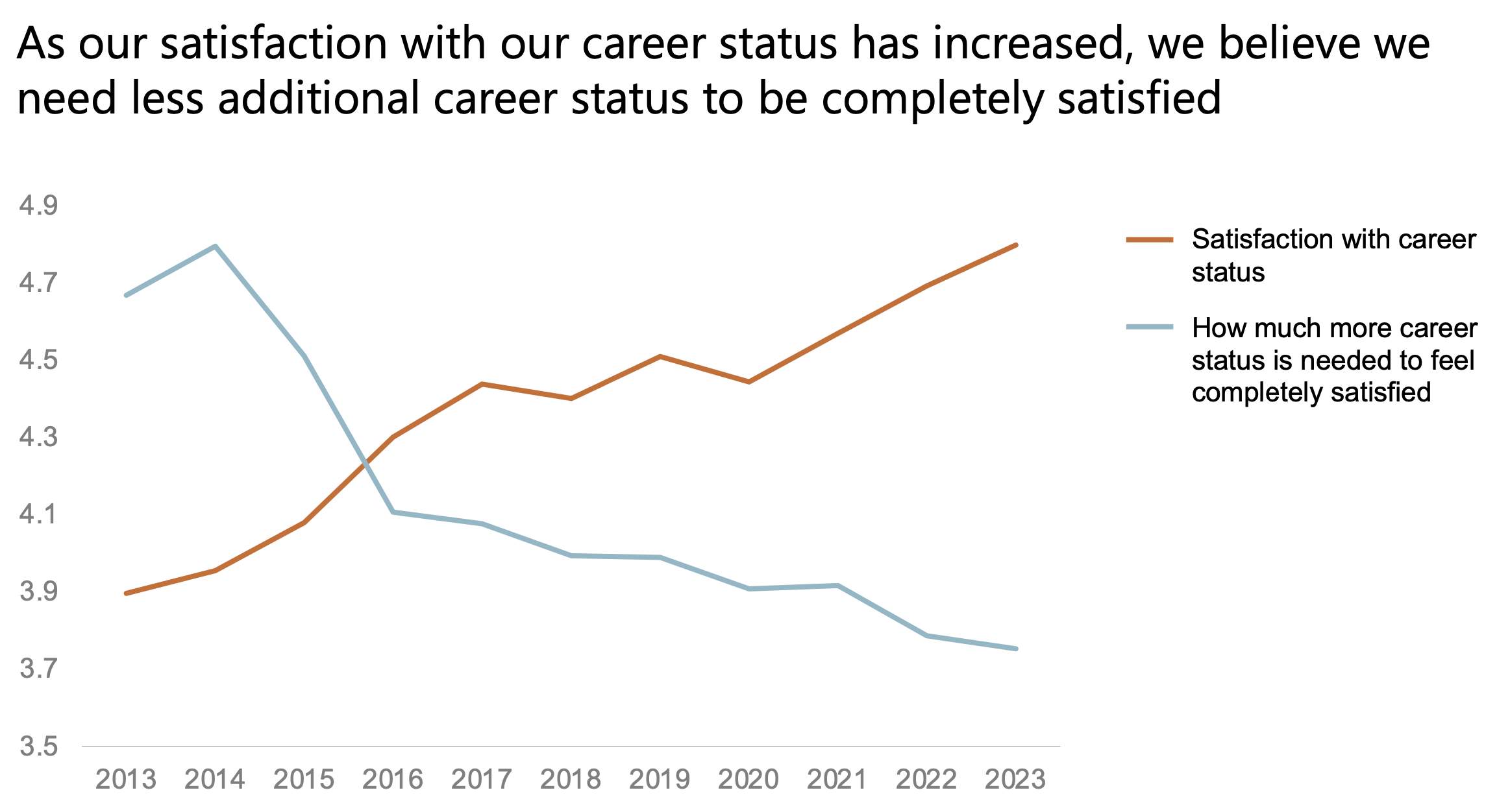 • 커리어에 대한 만족도가 증가하면서 만족을 위해서 얼마나 커리어가 더 필요하냐는 응답에 대해서 그 양이 갈수록 줄어듬