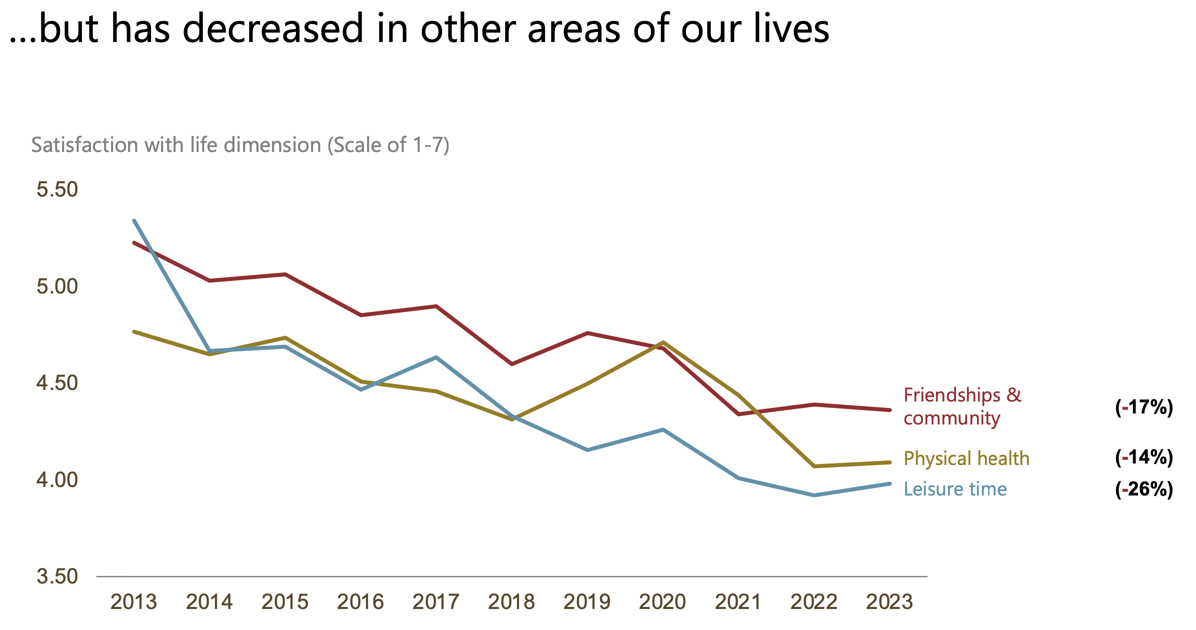 • 친구/커뮤니티, 건강, 여가시간 관련 만족은 감소