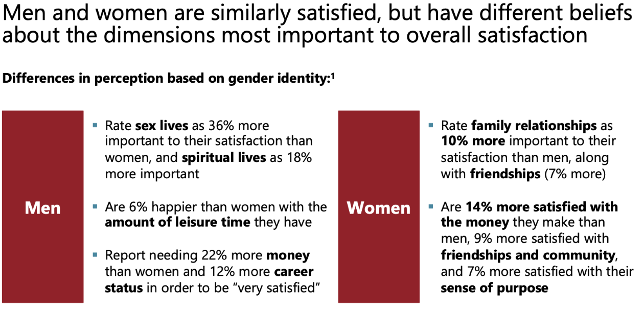 • 남성/여성의 만족도는 비슷했지만 남성이 더 가중치를 두는 부분 (성생활, 영적생활, 커리어/돈)과 여성이 더 가중치를 두는 부분 (가족관계/친구/커뮤니티/목적의식) 은 다르게 나타남