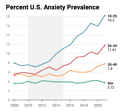 종합하면 이렇다. 10대 우울증 등의 정신질환은 2010년-2015년 사이 급증하고 특히나 여자아이에서 더 높게 나타난다. 십대 뿐 아니라 대학생들의 정신질환도 같은 시기에 급증하기 시작했다. 특히나 25세 이상의 나이대에서 불안증상이 높게 증가했고 나이가 높아질수록 불안증상은 크게 변화하지 않았다. 청소년의 자해, 자살시도도 같은 시기에 급증했다.
