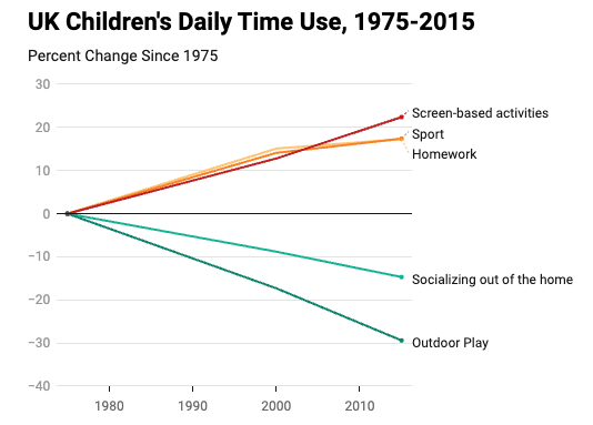 영국 아이들이 보내는 시간이 1975년부터 2015년까지 40년간 어떻게 바뀌어 왔는지 보여주는 그래프