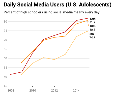 위 그래프는 미국의 청소년들중 매일 SNS를 하는 사람들의 비율로 2015년에 접어들자 그 비율이 중학생부터 이미 75% 이상에 육박하는 것을 볼 수 있다. 연구결과 10대 아이들은 하루 평균 일곱시간을 스마트폰 등의 스크린을 보며 레져시간으로 즐긴다고 한다. 2024년의 한국의 상황은 더하면 더했지 덜하지 않으리라. 이런 과다한 스마트폰 사용, 그리고 특히 SNS사용은 어린아이들과 청소년에게 어떤 악영향을 미칠까? 조나탄 하이트는 크게 네가지를 이야기한다.
